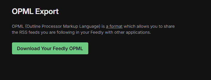 4. 「Download Your Feedly OPML」という大きなボタンが表示されるので、それをクリック。購読データ(OPMLファイル)をパソコンのデスクトップなど、適当な場所に保存します。