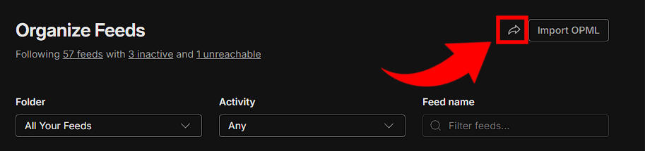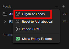 1. Feedlyの左サイドバーにある「Feeds」という項目の右側、三点リーダー(…)をクリックします。