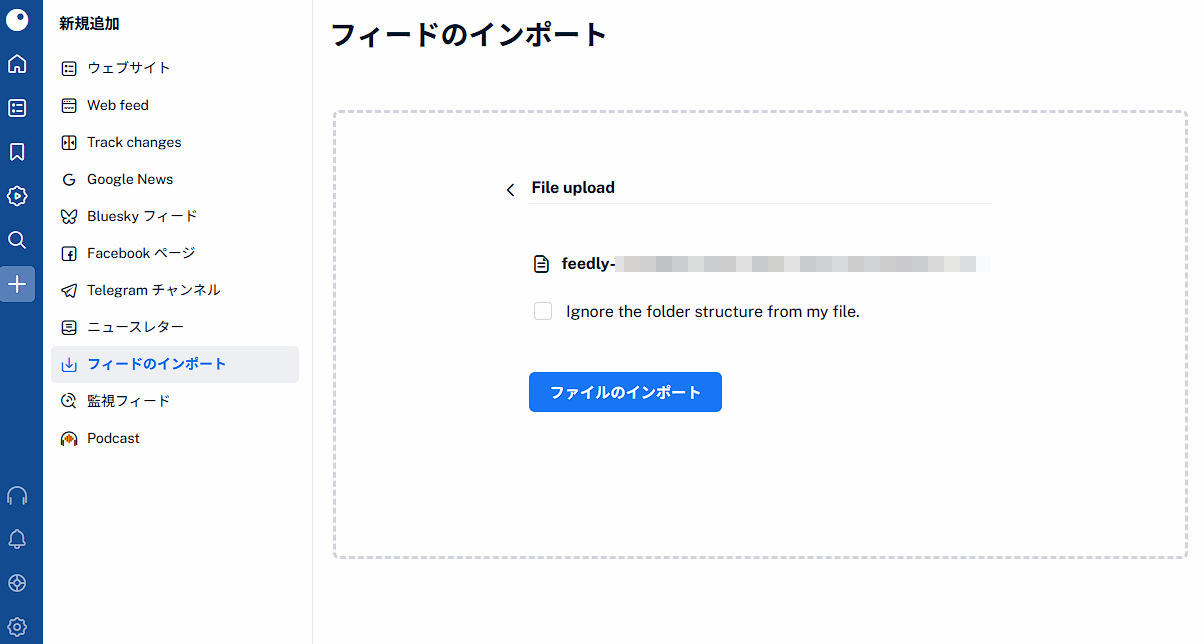 続いて、今ダウンロードしたファイルをInoreaderへ読み込ませます。