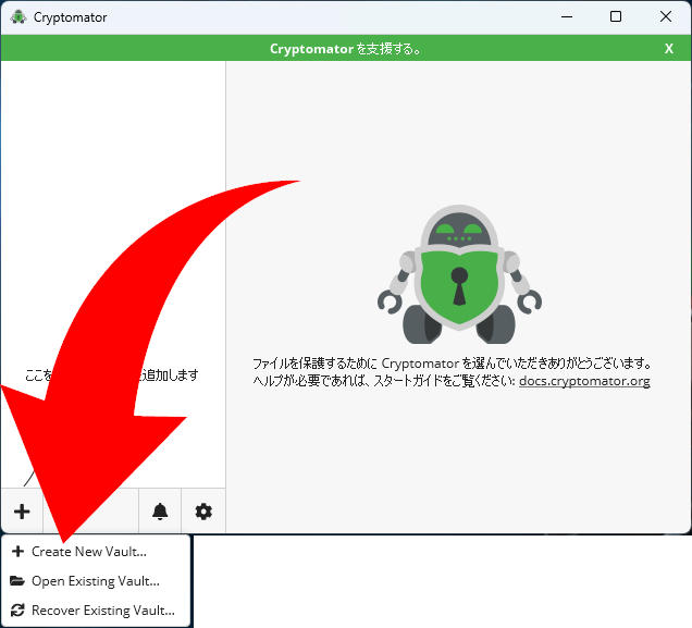 - Cryptomatorを起動し、左下の「+」ボタンをクリック。