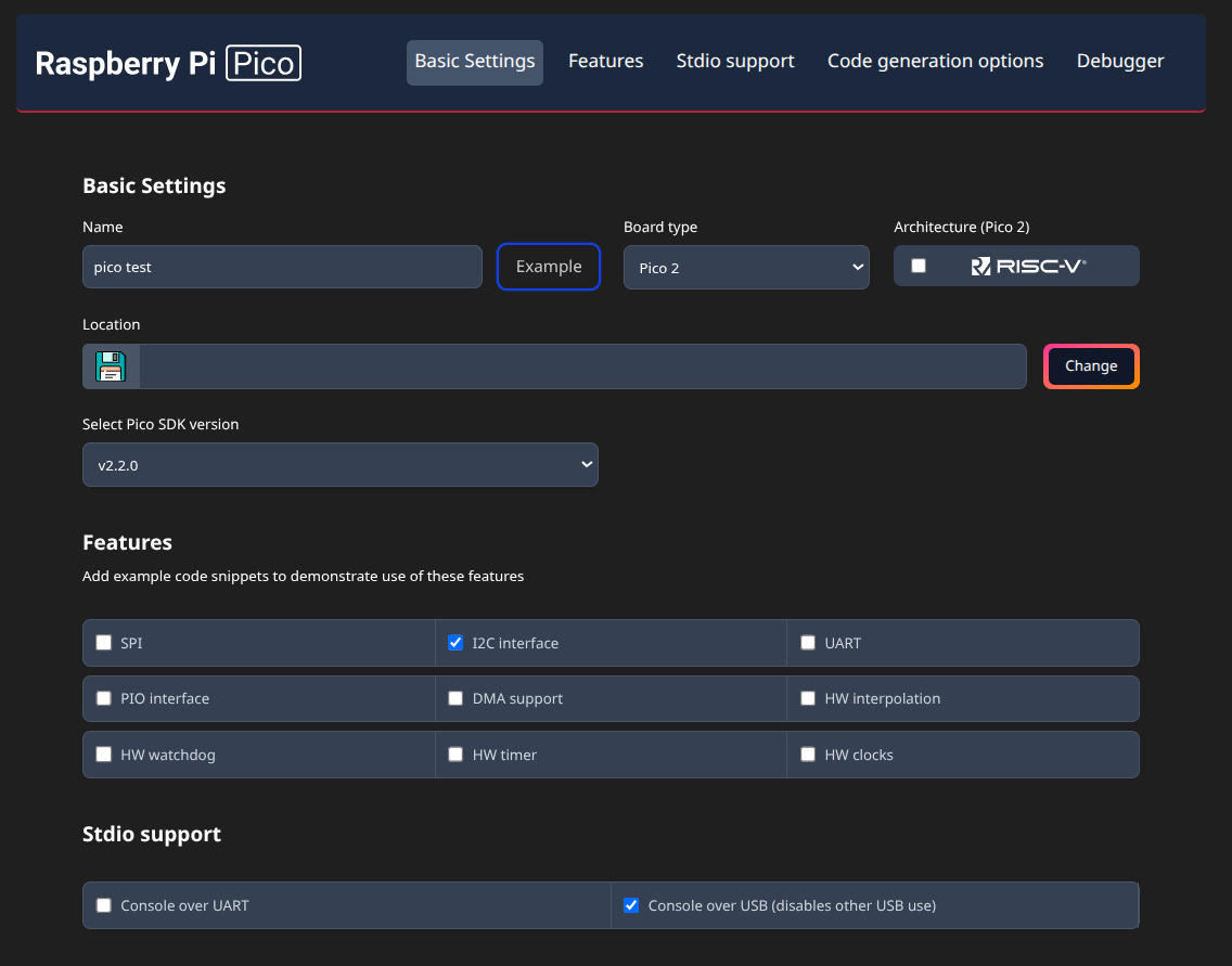 I2CやPIO(Programmable I/O)の設定をGUIでポチポチ選ぶだけ。