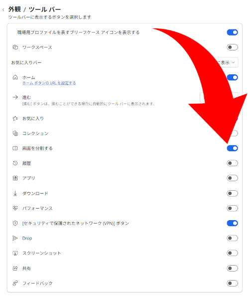 - [ツールバーのカスタマイズ] にある「画面を分割するボタン」をオンにします。